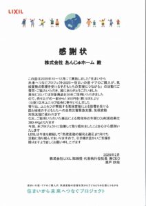 このたび、あんじゅホームは住まいから未来へつなぐプロジェクトに参加し、感謝状をいただきました!